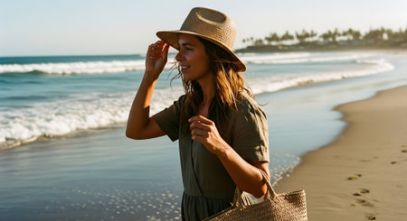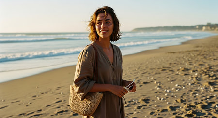 Beautiful brunette woman walking on the beach at sunset, wearing casual clothes