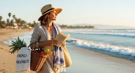 A serene woman enjoying a peaceful beach moment with a picnic setup