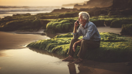 A silhouette of a person walking along a tranquil beach covered in seaweed. The sun sets over the horizon, casting a warm glow on the serene coastal landscape.