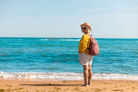 Stylish woman traveler in a summer straw hat with a tourist backpack and thermo mug back stands and looks at the beautiful seascape