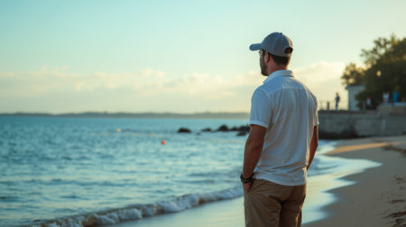 Man is standing on the beach looking out at the ocean. The sky is blue and the water is calm