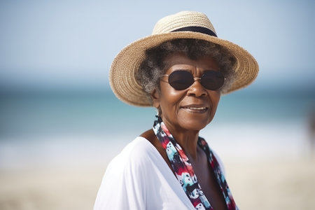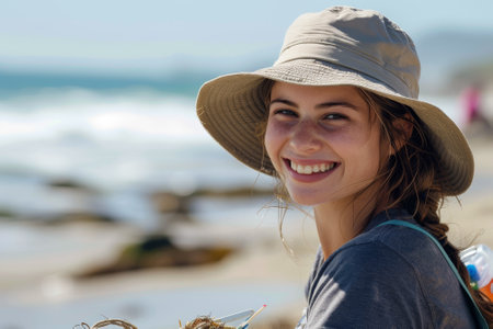 A woman is smiling and wearing a hat on a beach. She is holding a bottle in her hand
