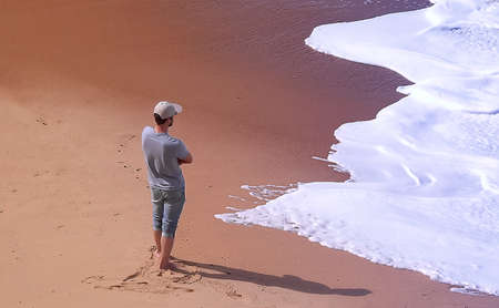 A young man stands alone on a sandy beach, looking down with a somber or contemplative expression as the sun sets over the ocean. The beautiful but melancholic scene evokes feelings of sadness, loneliness, introspection, and heartbreak.