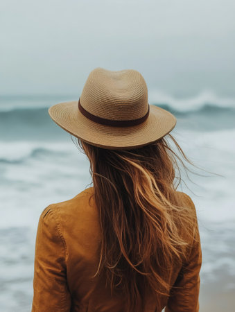 Woman with long brown hair wearing a straw hat and a yellow jacket looking at the ocean on a cloudy day