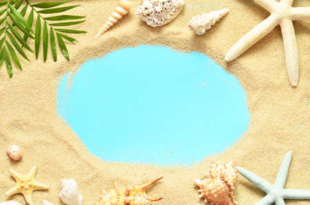 Sand background. Summer island. Sea shore. Seashell stone nature elements frame design decoration on golden beach surface with copy space.