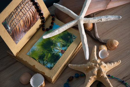Composition of sea shells, stars and album reminiscent of the summer holidays.