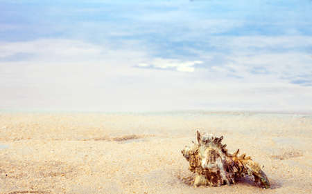 Shell sea with seashells, shells on sand tropical ocean beach. Copy space of summer vacation and business travel concept