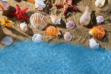 Summer advertising marine concept on a beige background. Background with seashells different shape and type in the sand. Top view, copy space