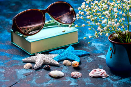 Beach accessories. Seashells, sunglasses and starfish on a dark blue background. With copy space. Selective focus