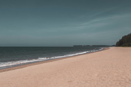 Khao Lak Phang Nga Thailand February 06, 2020 Tropical natural paradise Khuk Khak Beach with turquoise blue water waves blue sky and palm trees in Khao Lak Phang Nga Thailand.