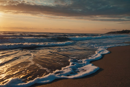 Experience the calm beauty of ocean waves rolling onto a sandy beach at sunrise, creating a serene and tranquil atmosphere in this picturesque coastal landscape.