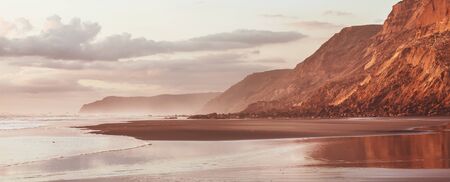 Beautiful Sunset at the Ocean Beach, New Zealand. Inspiring natural and travel background