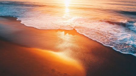 This image captures the serene beauty of a beach at sunrise, showcasing the golden hour's warm light casting soft shadows across the sand. The sky displays a spectrum of vivid colors from deep oranges to soft pinks, creating an inspiring and peaceful ambiance. Ideal for use in relaxation and wellness content, or as a backdrop for contemplative scenes. AI-generated illustration.