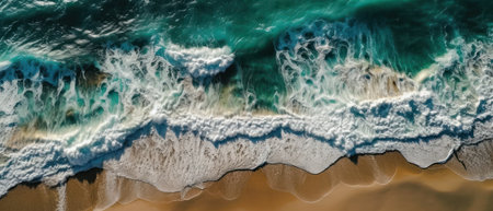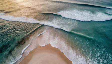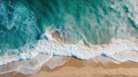 Aerial view of turquoise ocean waves breaking on sandy beach generative AI