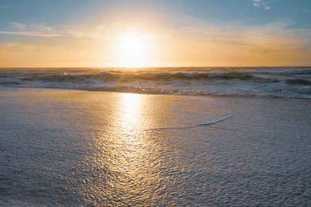 Beautiful sunset on the beach. Sea waves on the sandy beach at sunset.