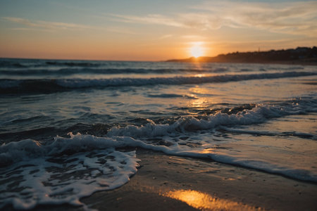 Experience the calm beauty of ocean waves rolling onto a sandy beach at sunrise, creating a serene and tranquil atmosphere in this picturesque coastal landscape.