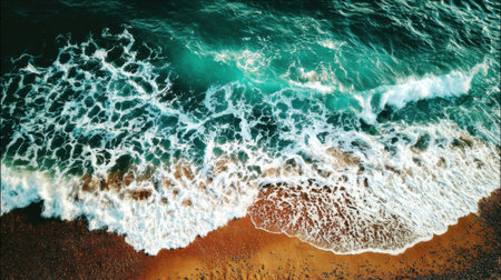 Stunning aerial shot of ocean waves breaking on a sandy beach. The turquoise water and white foam create a dramatic contrast.
