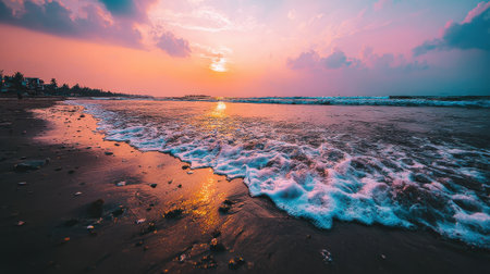 Soft waves wash onto the sandy beach as the sun sets, painting the sky in shades of pink and orange while creating a peaceful atmosphere.