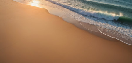 a breathtaking beach sunset from a top view, with golden light reflecting on the water and casting long shadows on the sand.
