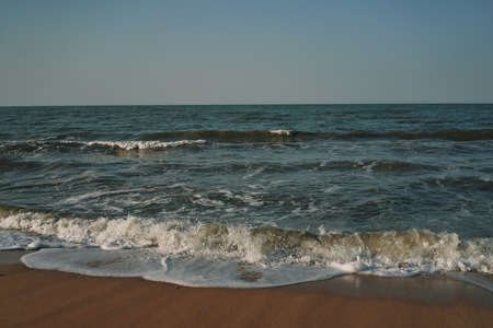 Seascape, sea view. Waves at sea, sea tide, sandy shore. Sea foam. Beautiful clouds in the blue sky. Traveling in Asia.