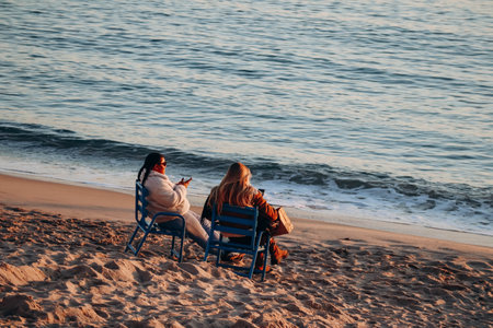 Cannes, France - 30.01.2023 : People relax on the shores of the Mediterranean Sea in Cannes, in January at sunset