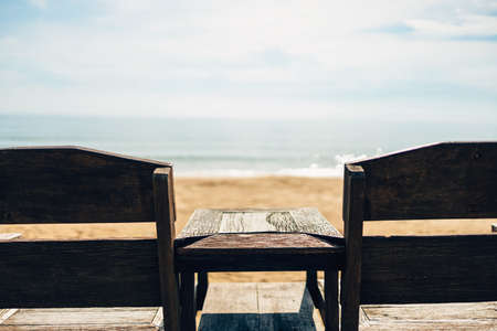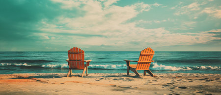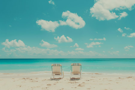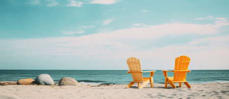 Two wood chairs on a tropical sandy beach sunny day.