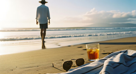 A man walks alone on a serene beach at sunset with a refreshing drink