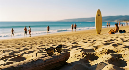 A pair of sunglasses on a log at a sunny beach with people in the background
