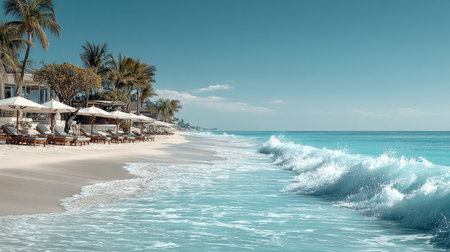 A stunning view of a pristine tropical beach with golden sand, crystal-clear waters, and swaying palm trees, perfect for a tranquil escape.