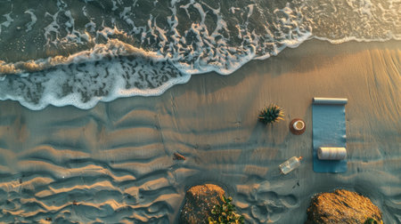 A serene beach scene with a hat, sunglasses, and a book on the sand