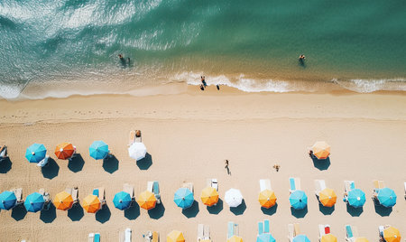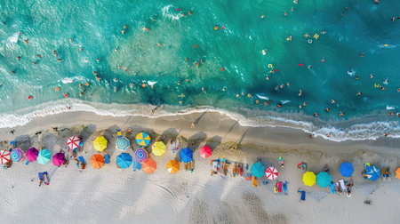 A birdseye view of a sandy beach adorned with colorful umbrellas, people enjoying the sun and water, against a backdrop of a vast blue sky AIG50