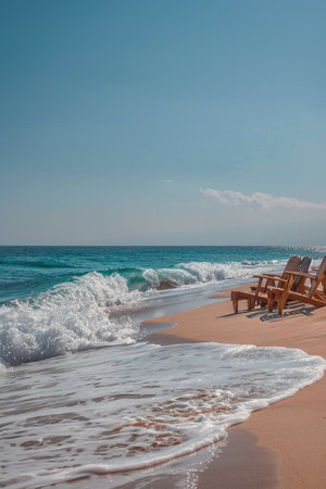A tranquil beach scene, deserted chairs suggesting a hiatus in tourism, with ongoing waves crashing against the shore