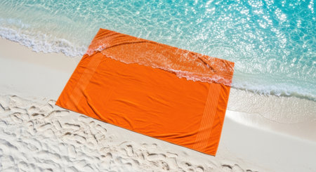 An orange beach towel lies on pristine white sand at the edge of clear turquoise ocean water with a gentle wave washing over it. Top view of a tropical beach scene.