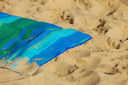 Summer vacation. Closeup of empty striped blue green mat towel blanket on the beach. Sunbath tan relax on the sea coast. Summertime.