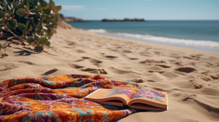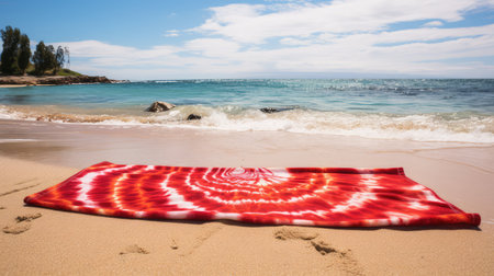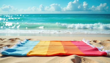 A vibrant beach towel lies on soft, white sand near the tranquil ocean, offering a serene atmosphere perfect for relaxation and summer getaways.