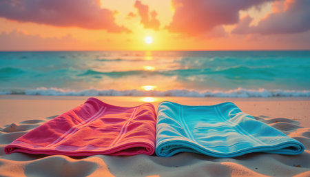 Vibrant towels laid out on a sandy beach during a stunning sunset over the ocean.