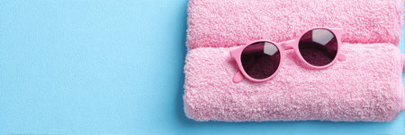 Soft blue beach towel with sunglasses on sand, top view. Space for text