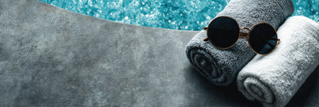 Sunglasses rest on towels near a refreshing pool, creating a minimal summer setting ideal for relaxation and enjoyment under the sun.