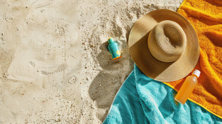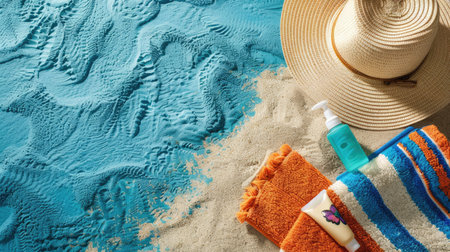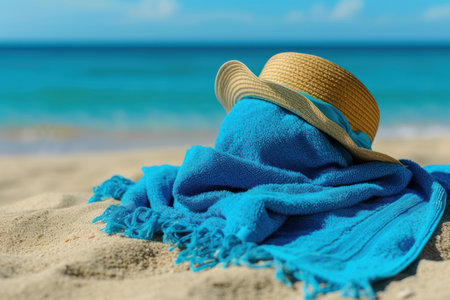 Tranquil and serene tropical beach vacation concept with straw hat, blue towel, and relaxation accessories