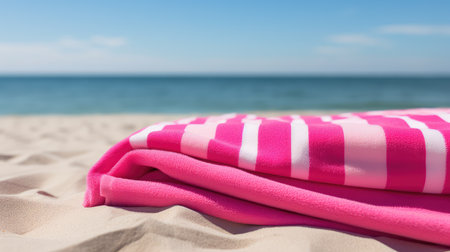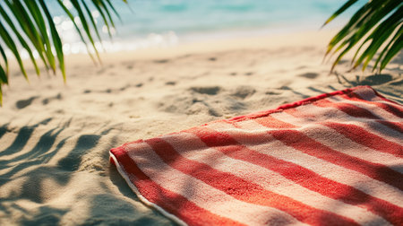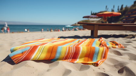 a sunny day at the beach, where a striped towel lies elegantly amidst golden sands, capturing the essence of relaxation and serenity with an aesthetic touch