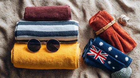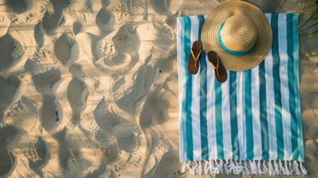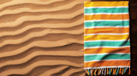 Top-down view of a striped beach towel on golden sand, ready for a day at the beach. Space for text, perfect for summer vacation themes