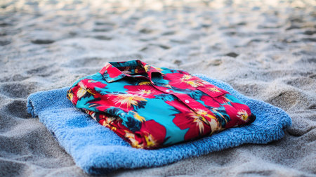 A bright floral shirt is neatly folded on a soft blue towel, resting on sandy beach surroundings. This image captures the essence of summer relaxation and leisure.
