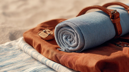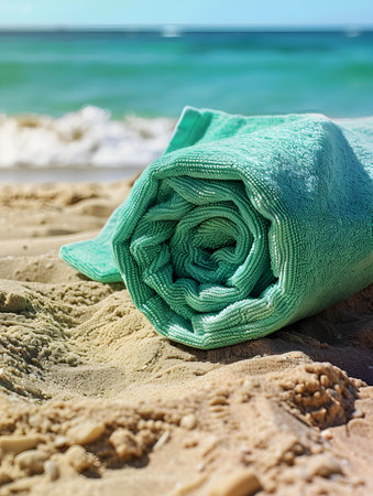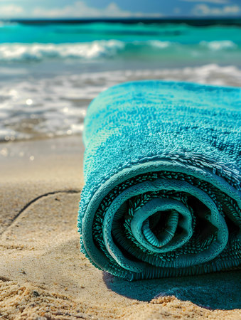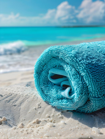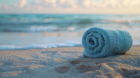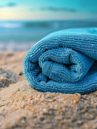 close-up of a sky-blue rolled towel on sandy shores, framed by a breathtaking seascape.