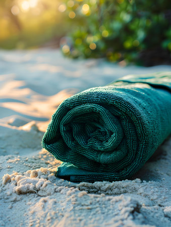 Close up of a rolled dark green towel on sandy beach. Beautiful summer wallpapers