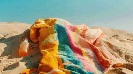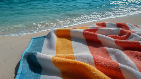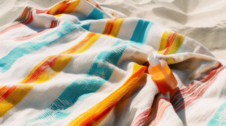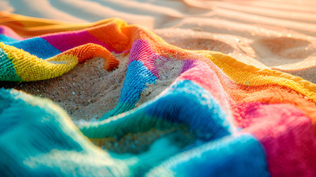A vibrant beach towel rests on softly rippled sand, creating a serene summer scene. The bright stripes enhance the warm, inviting atmosphere of leisure and relaxation.