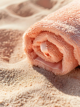 Close up of a rolled peach fuzz towel on sandy beach. Beautiful summer wallpapers