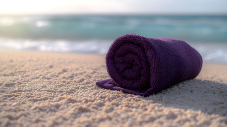 Close up of a dark purple rolled towel on beach sand. Vacation Background with Copy Space