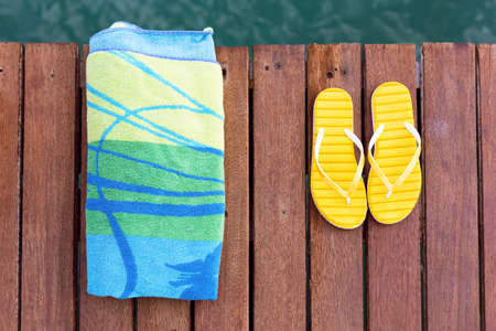 Concept of beach accessories at the wooden pier