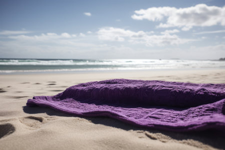 Purple towel with pattern on beach with sea and blue sky, created using generative ai technology. Seaside landscape, vacation, leisure, summer and nature concept digitally generated image.