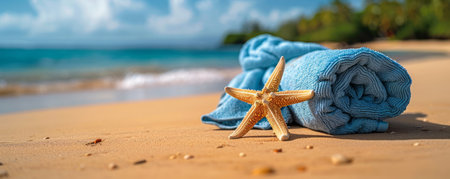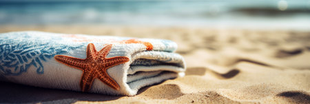 Closeup of towel with starfish on sandy beach, shallow depth of field generative ai